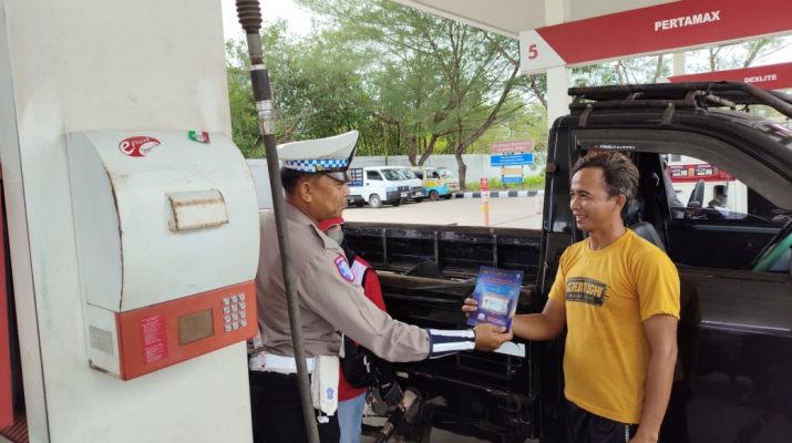 Personil Satlantas Polres Katingan sebagai anggota preemtif bergerak turun ke Jalan untuk meninformasikan kepada pengendara melalui pembagian brosur, untuk menciptakan keamanan dan keselamatan berlalu lintas.