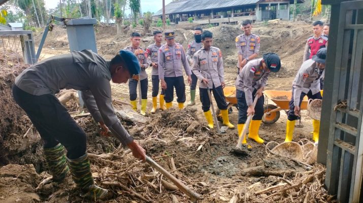 Dengan penuh semangat, personel Polri bersama warga bahu-membahu membersihkan lumpur yang mengendap di dalam ruangan pelayanan, kamar pemeriksaan, garasi, hingga area lingkungan sekitar Polindes.