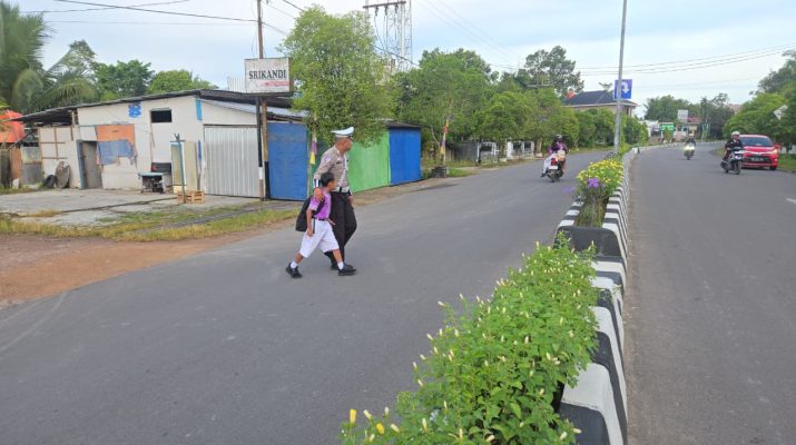 Personil Sat Lantas Lamandau Bantu Menyebrangkan Anak Sekolah