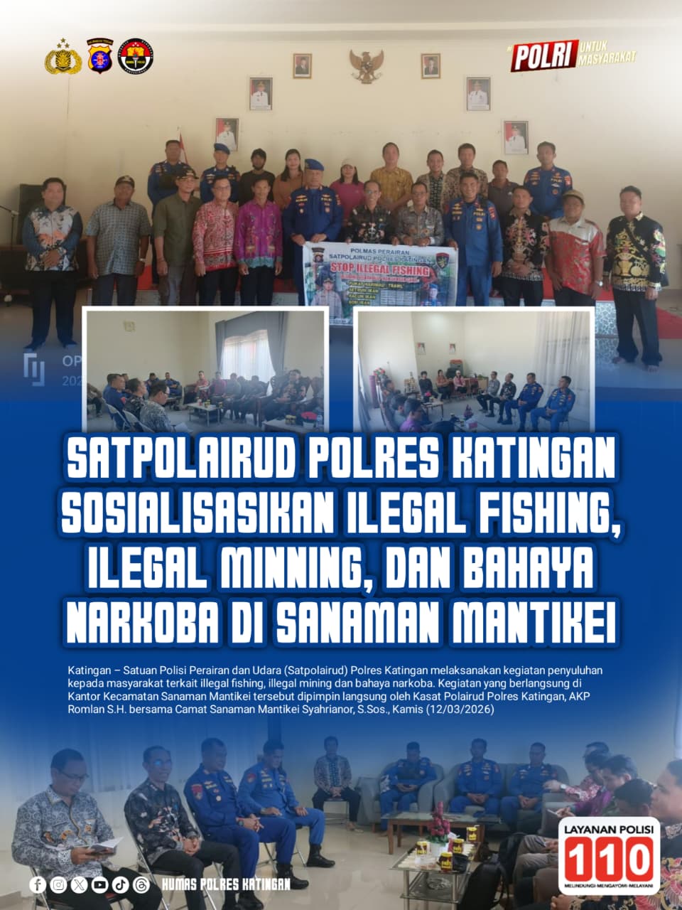 Katingan – Satuan Polisi Perairan dan Udara (Satpolairud) Polres Katingan melaksanakan kegiatan penyuluhan kepada masyarakat terkait illegal fishing, illegal mining dan bahaya narkoba. Kegiatan yang berlangsung di Kantor Kecamatan Sanaman Mantikei tersebut dipimpin langsung oleh Kasat Polairud Polres Katingan, AKP Romlan S.H. bersama Camat Sanaman Mantikei Syahrianor, S.Sos., Kamis (12/03/2026)